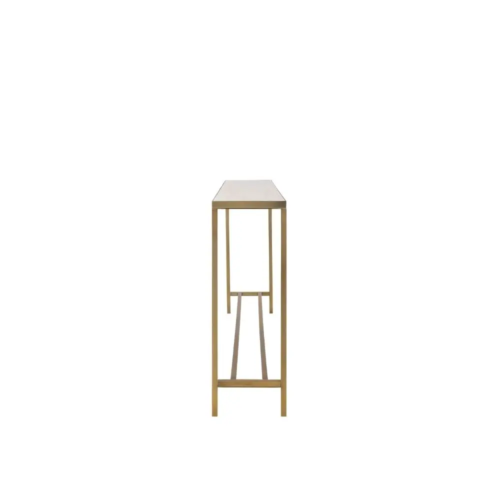 Made of travertine and antique brushed brass-plated iron, this luxurious accent console table will elevate any home or office. Display it in an entryway to wow guests upon arrival, try it as a sofa table to hold an eye-catching vignette or in a dining room as a stylish bar. Tap into your creativity for endless uses.