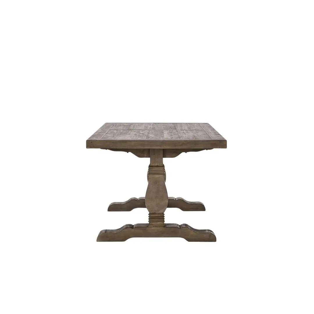 The Caleb Dining Table combines rustic charm with timeless sophistication. Crafted from FSC Certified reclaimed pine wood with a weathered finish, it features a rectangular tabletop that highlights the natural grain and texture. The double pedestal base adds a classic touch and provides sturdy support. Perfect for family gatherings or elegant dinners, the Caleb Dining Table is a stylish and functional centerpiece for any dining room.