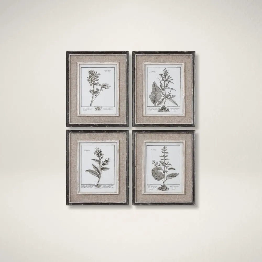 These botanical prints feature a contemporary take on an antique style. Each black and white print is surrounded by a light tan burlap mat. The outer frames have a heavily distressed black finish with a gray and taupe wash. The inner lips and fillets have a medium wood tone base with a heavily distressed white painted finish and a gray and taupe glaze. Each print is placed under protective glass.