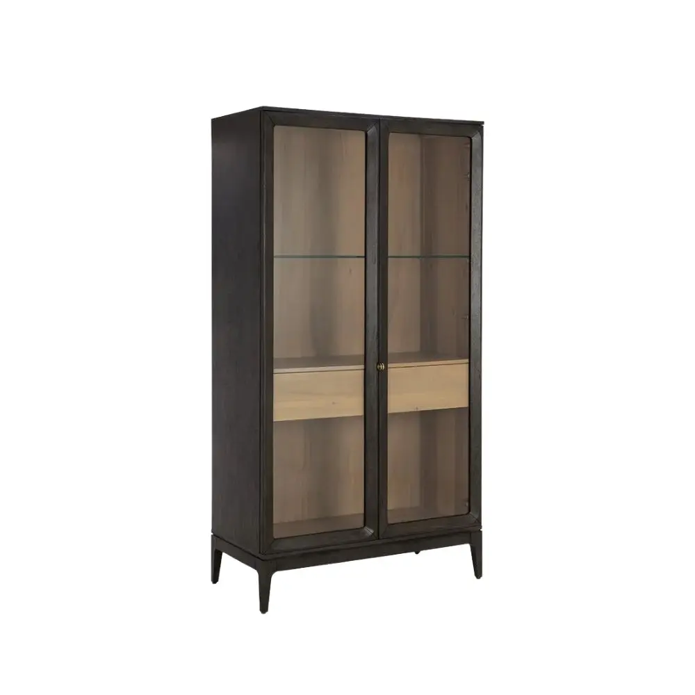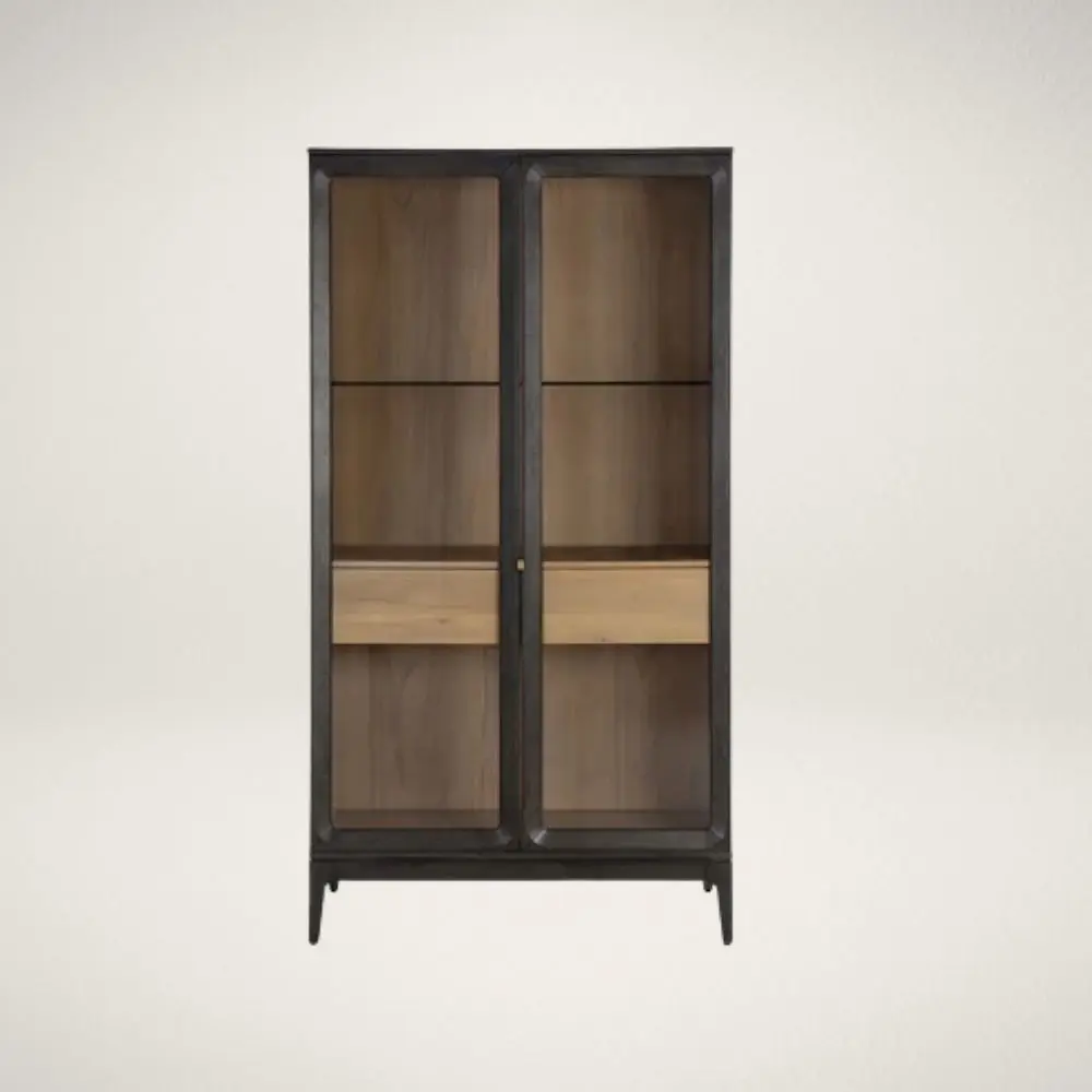 Boasting sharp lines brought to life with acacia veneer, the Cecilia Display Cabinet is a mid-century delight. Accented with brass handles and finished with solid rubberwood legs, this cabinet features generous shelving space and in-cabinet drawers to proudly showcase your beautiful treasures.
