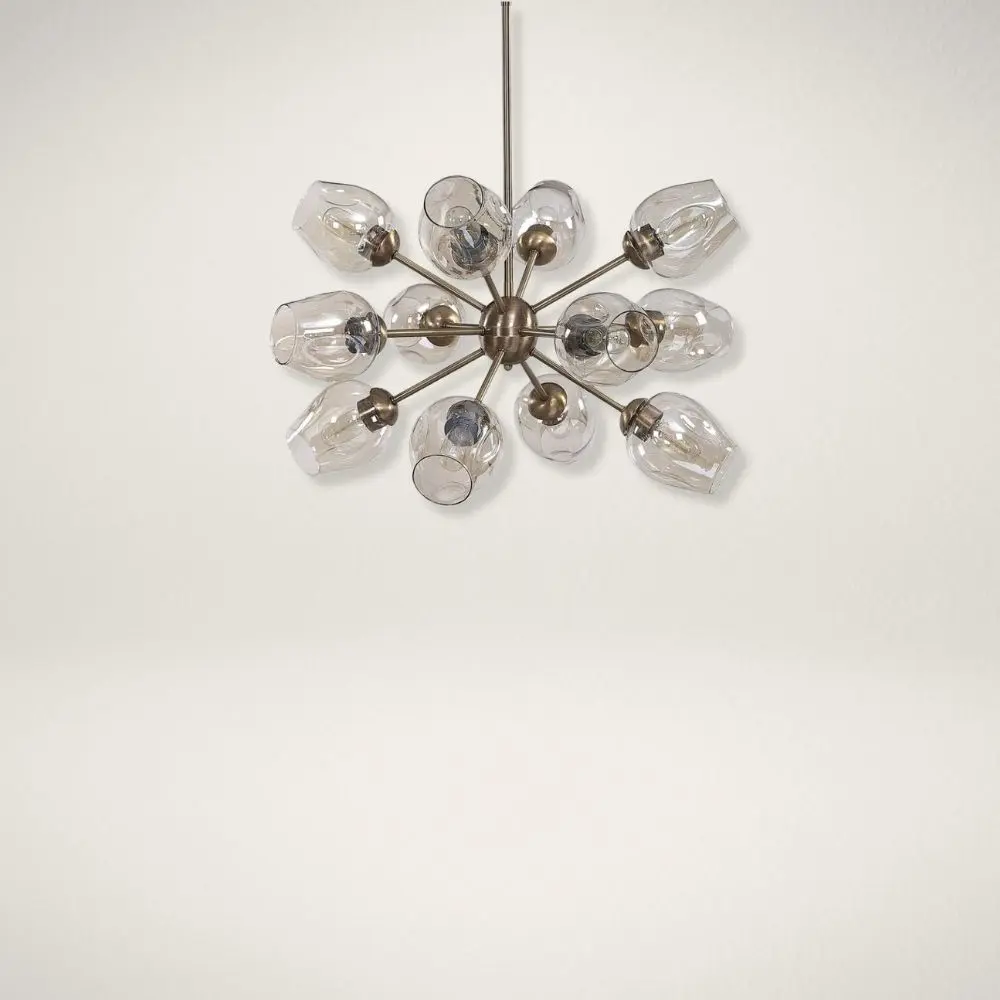 Transitional with a flair of Mid-Century sputnik style, our 12 Lt. rod hung chandelier, features a warm antique brass finish with plated amber dimpled glass shades. 12-60 watt max, Edison sockets. Bulbs not included. Supplied with 15′ wire, 3-12″ stems and 1-6″ stem for adjustable installation.