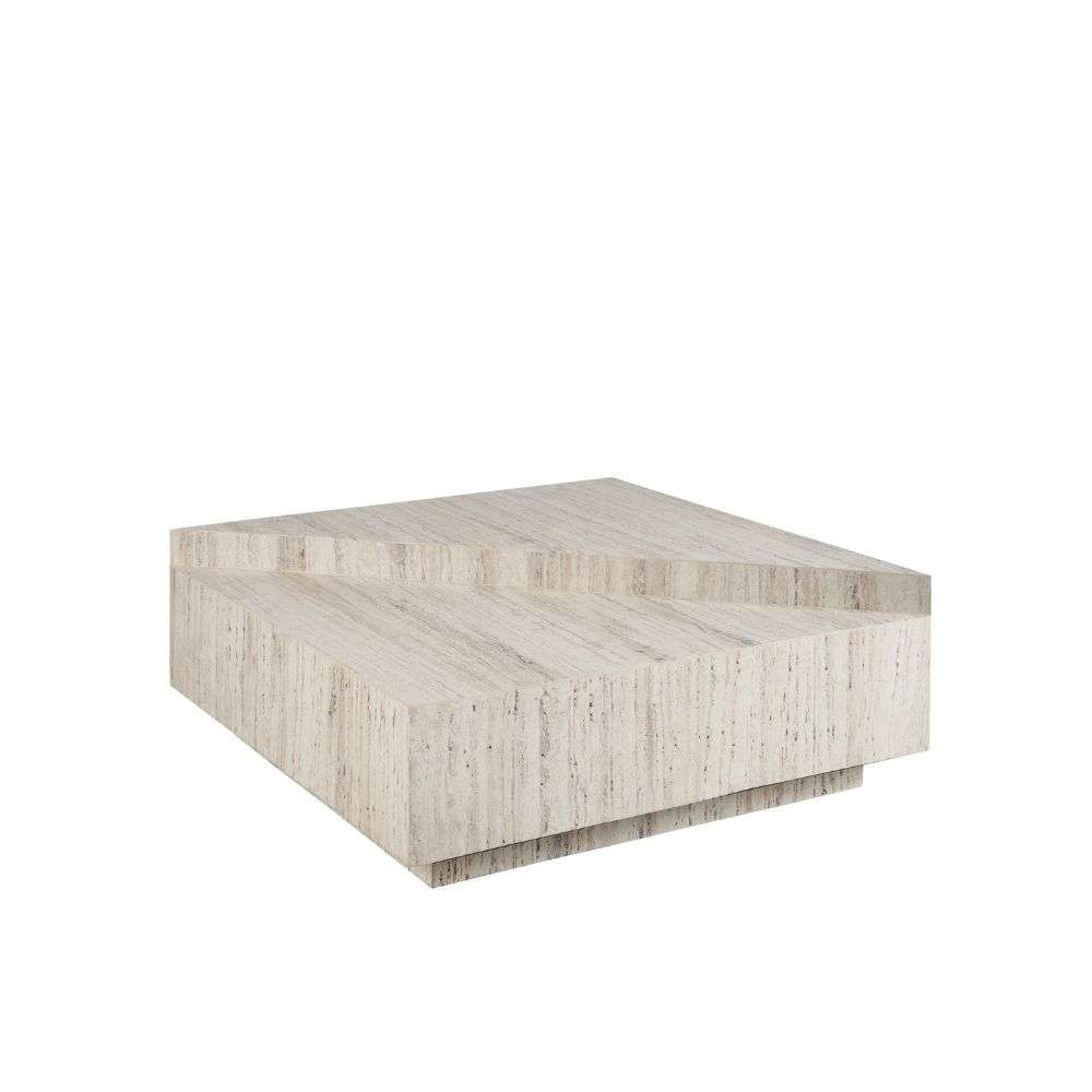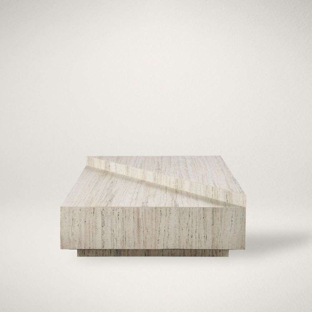The Daxton Cocktail Table, crafted from a full White Travertine body, combines mobility with modern design through its incorporation of casters. Its two-tier tabletop introduces an innovative twist with diagonal angling, adding a dynamic element to the piece’s structure and offering both aesthetic appeal and functional versatility.