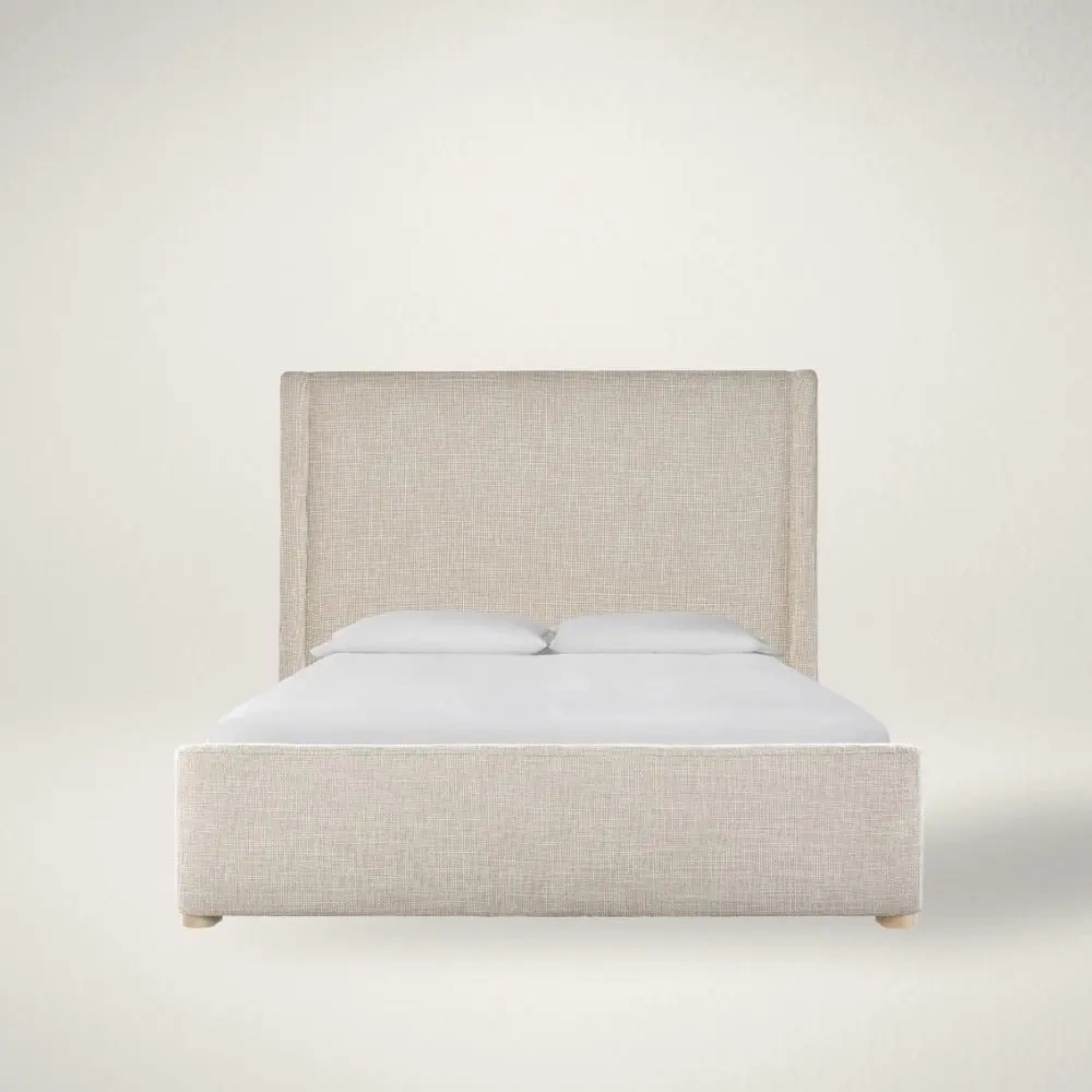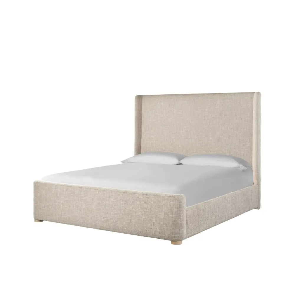 Featuring an extra-tall backboard, the Upholstered Shelter Bed makes a statement full of texture with a woven-inspired body and subtle circular legs.