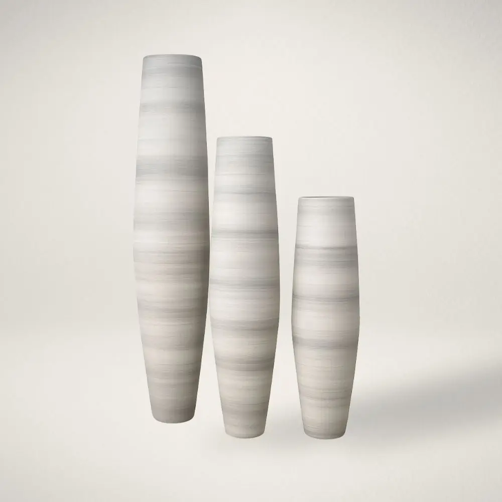 • Set of three tall vases in soft grey-to-ivory gradient tones