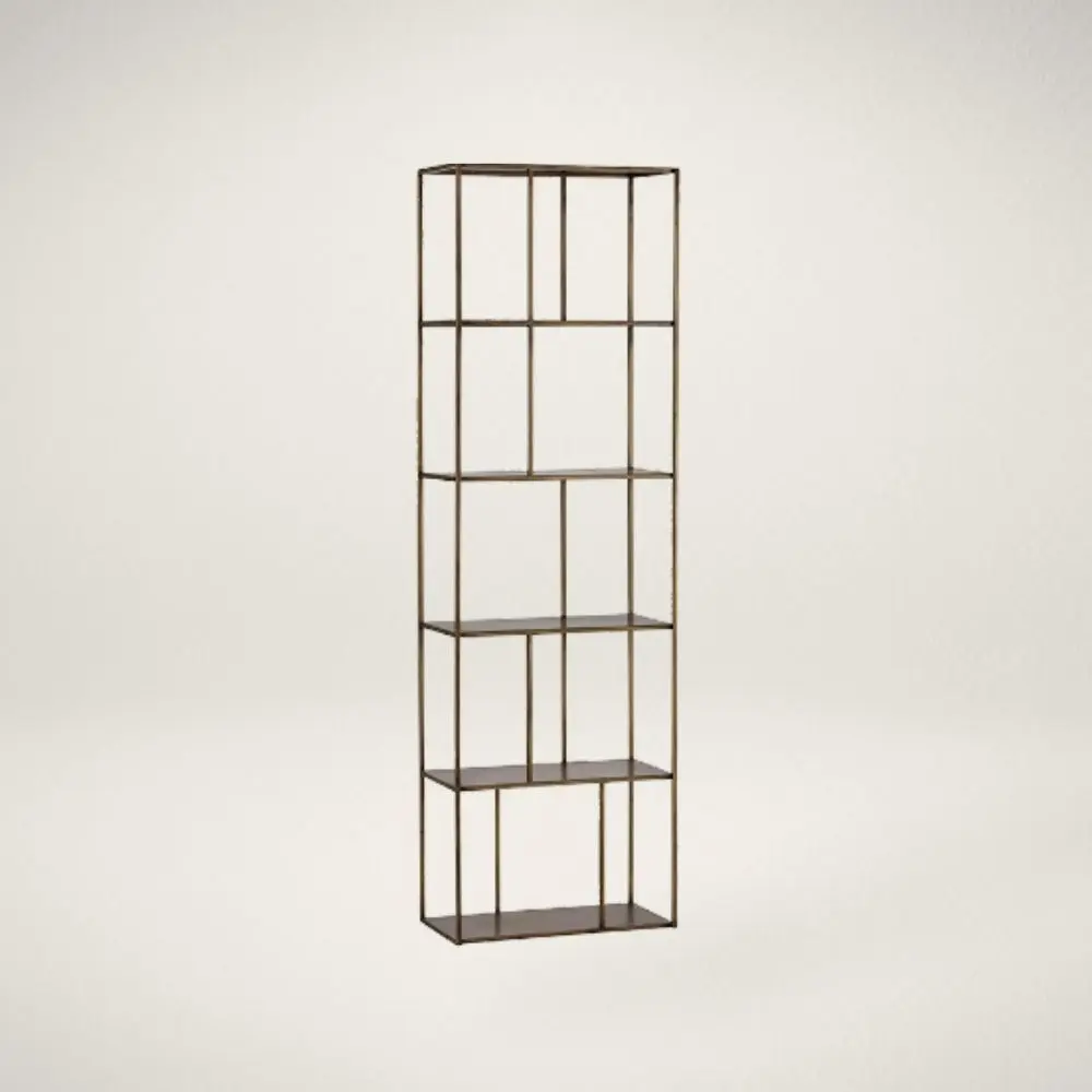 Add style and warmth to living and office spaces with this well-designed iron bookcase in a brushed antique brass finish. Can be placed in pairs or multiples for added impact and functionality. Anti-tipping kit included.