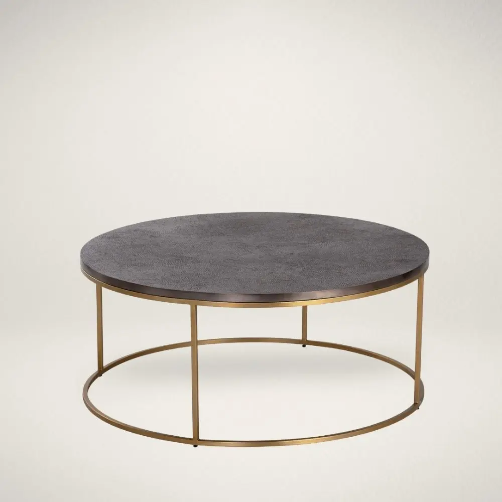 A round coffee table that takes influence from global travels. Features a bronzed gunmetal aluminum tabletop with a textured finish on the top. Completed with a brass stainless steel frame. Made in India. With refined craftsmanship, this design was brought to life by skilled local artisans. Due to the nature of handcraftsmanship, unique imperfections such as fissures, markings and variations in colour and shape are welcomed and appreciated characteristics for a truly one-of-a-kind piece.