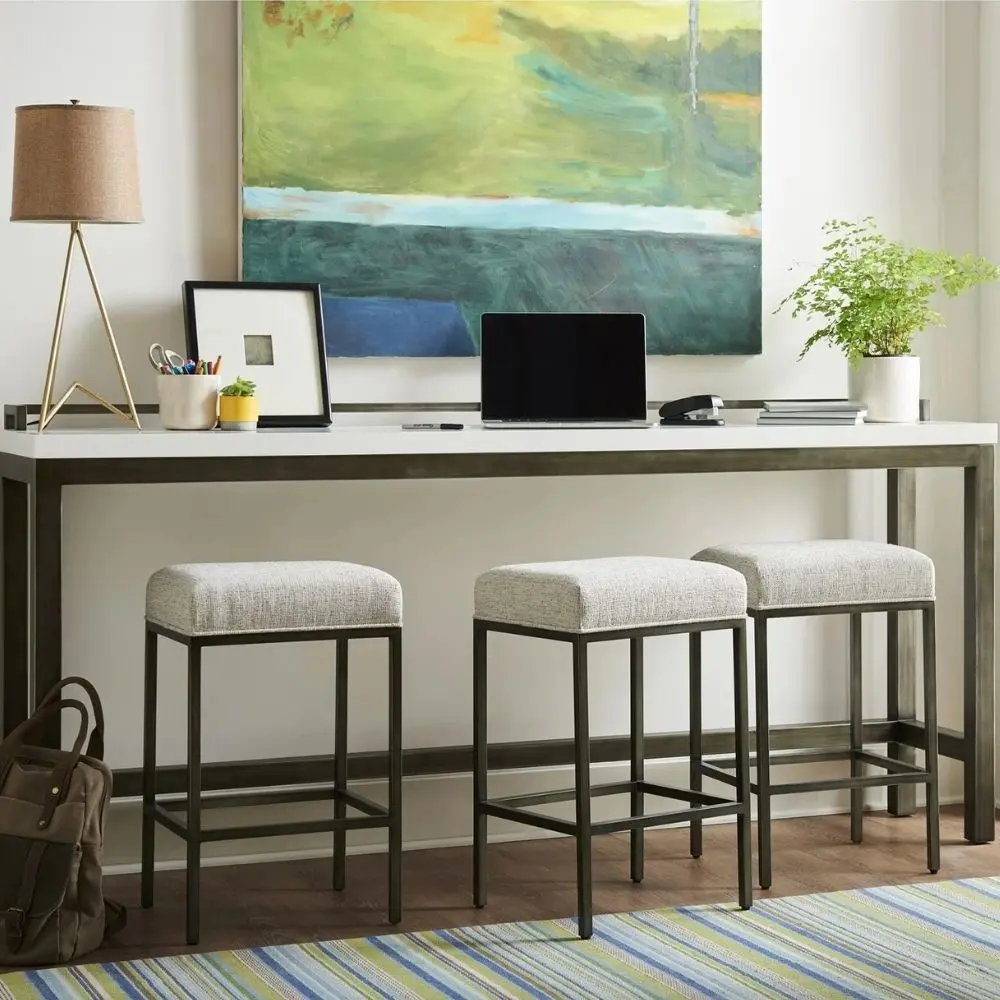 An artful ‘two-in-one’ furnishing of sorts, the Essence Console Table features a smooth, clean tabletop that neatly houses three upholstered stools underneath.