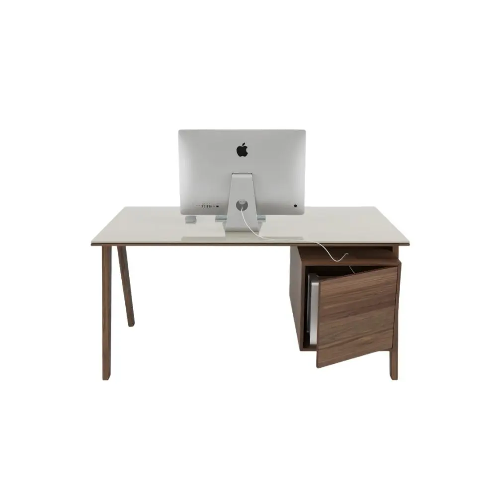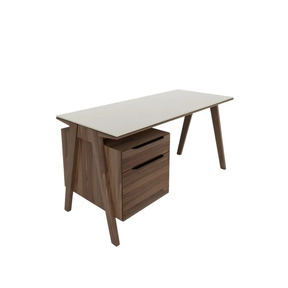This modern desk combines simplicity and functionality with a sleek design. Its spacious top, available in ceramic or lacquered glass, provides a comfortable and elegant workspace. The integrated pedestal, equipped with two drawers, allows for efficient organization of documents and supplies. With its minimalist lines, this desk is ideal for a contemporary and sophisticated work environment.