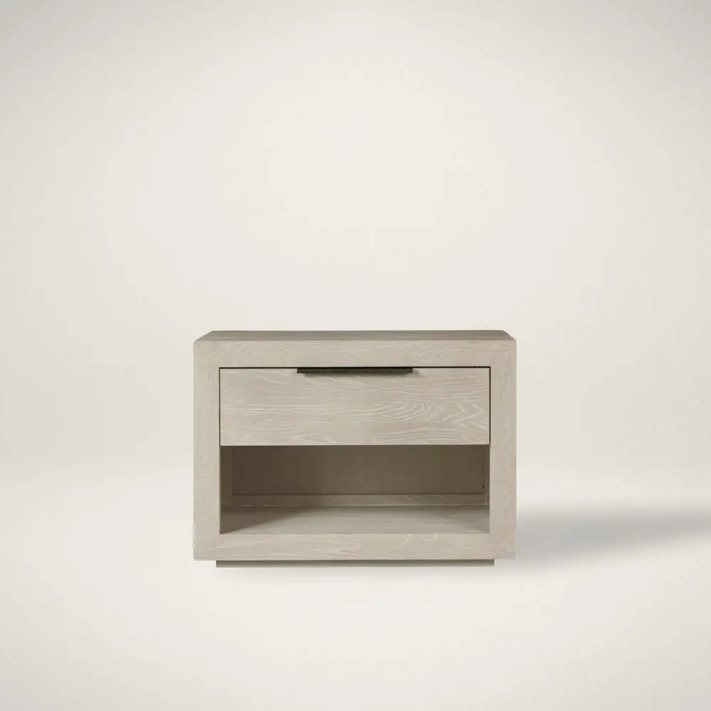 The Huston Nightstand is a perfectly sized bedside accent, showcasing one enclosed top drawer, a lower open display area, and a calming Quartz finish.