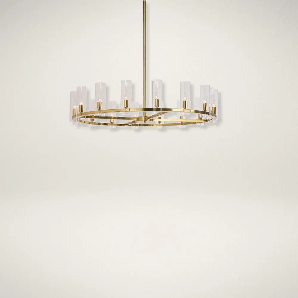 Brighten up any space with this large, sophisticated chandelier that invokes timeless elegance. Crafted with a metal wheel frame in a brass finish and features clear glass cylinder shades.