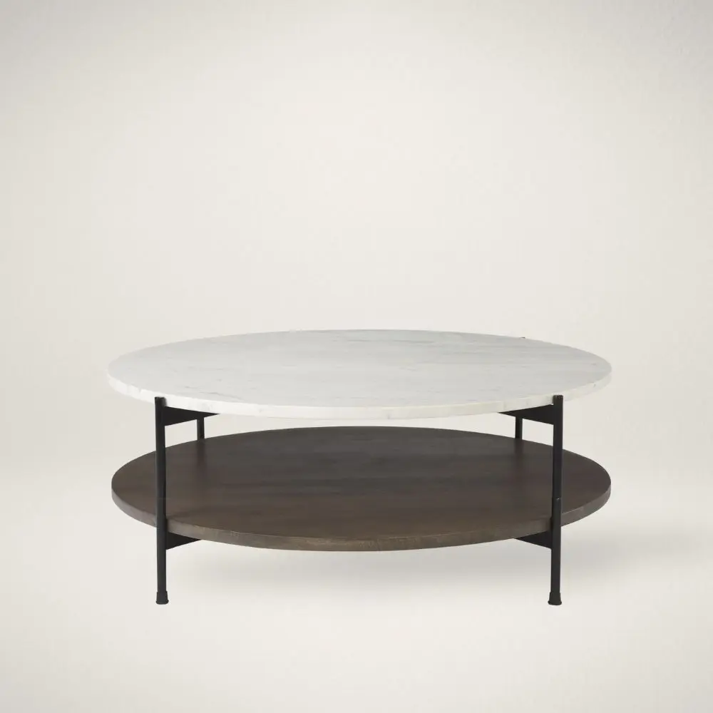 - Trifecta! Marble, Wood and Metal: This 2-tier coffee table comprises two round surfaces, a beautiful marble top and lower solid mango wood bottom shelf, supported by a sturdy black iron frame.