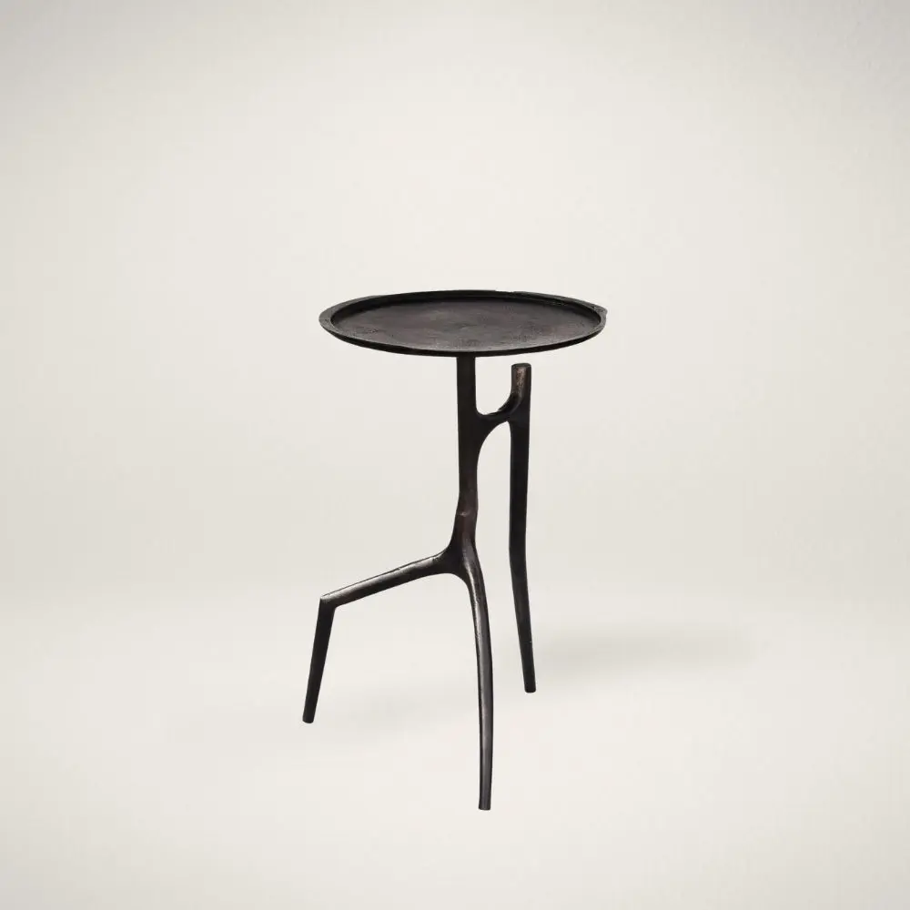 The Renwil Maadi Side Table is a unique accent piece designed to stand out. Crafted in black metal, this table features a minimalist round top supported by an abstract tripod-style base that resembles organic, branch-like forms. Its sculptural silhouette adds depth and dimension, making it an ideal choice for modern, industrial, or eclectic interiors. Perfect beside a sofa, armchair, or as a conversation-starting accent in any room, the Maadi combines function with artistry.