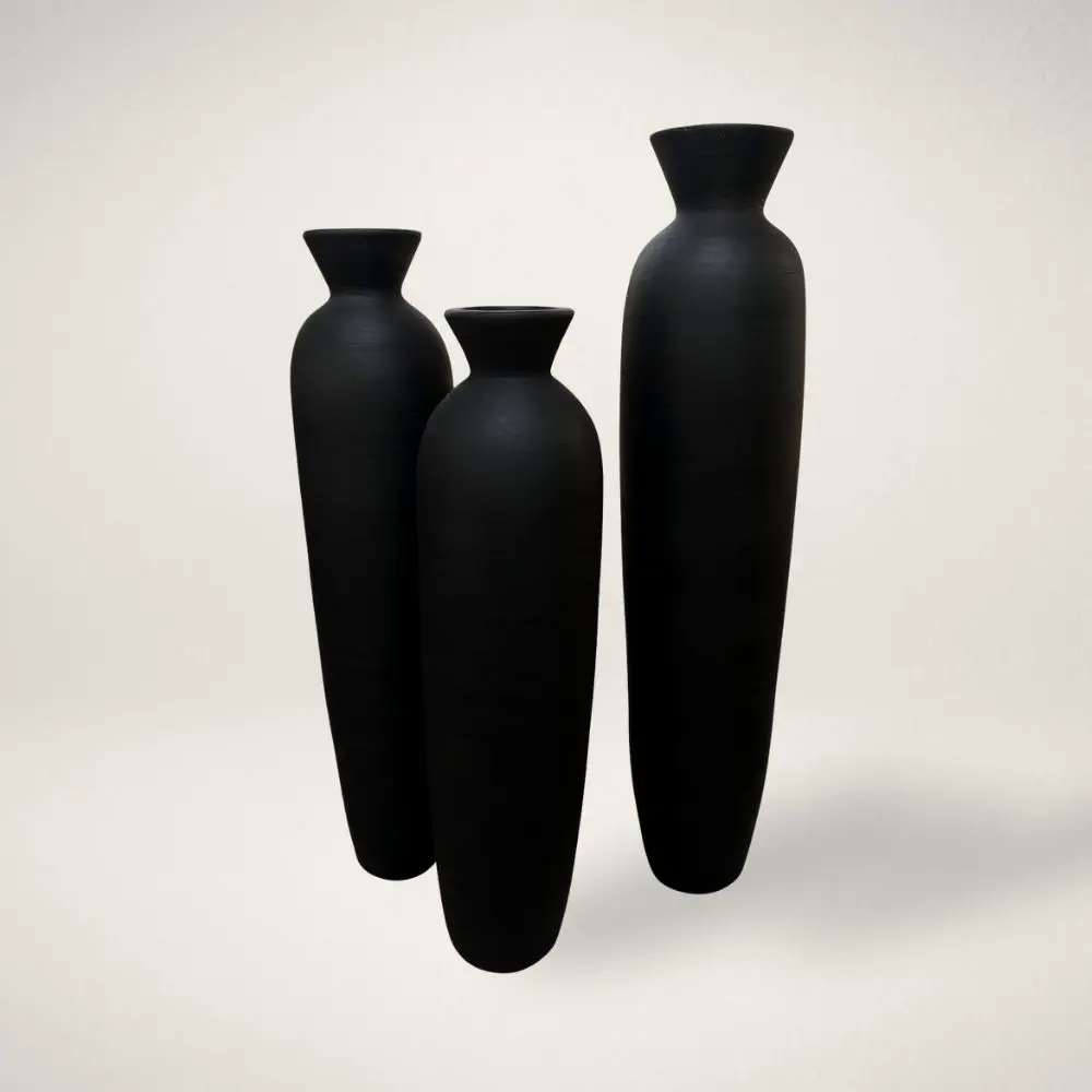 The Mood Dekor Madrid Vase Collection embodies quiet luxury with a powerful sculptural presence. Finished in deep matte black, each vase is hand-shaped with a subtly curved silhouette and elegant flared neck. Their dramatic height and minimalist form add depth, contrast, and modern refinement to any interior. Perfect for contemporary, monochromatic, or moody organic spaces, the Madrid set anchors a room with effortless sophistication โ€” whether styled as standalone art pieces or layered with textured greenery.