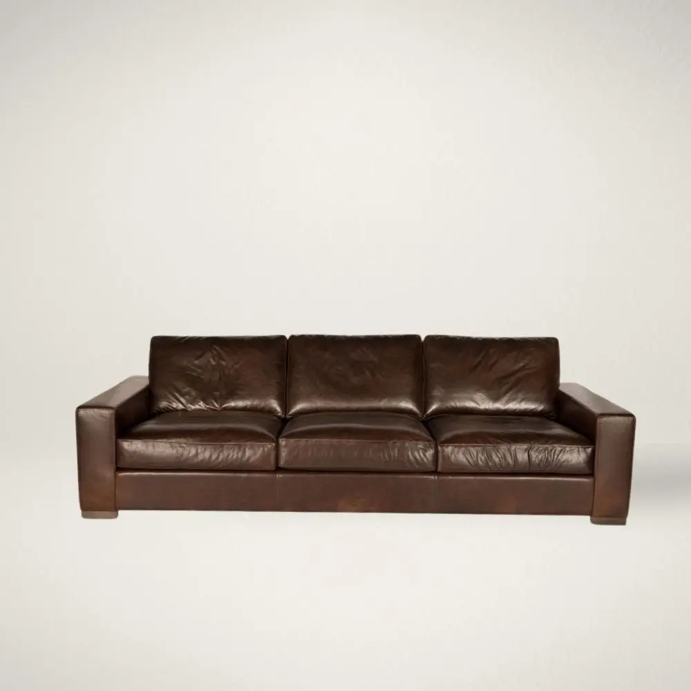 This rich brown leather sofa offers timeless appeal with its clean-lined silhouette, wide track arms, and generous deep seating. Crafted in supple top-grain leather with a naturally worn finish, it combines sophisticated style with everyday comfort. The structured back cushions and plush seats make it an inviting anchor for any living space, ideal for both formal entertaining and relaxed lounging. A perfect balance of rugged luxury and modern elegance.