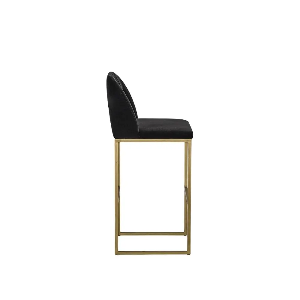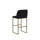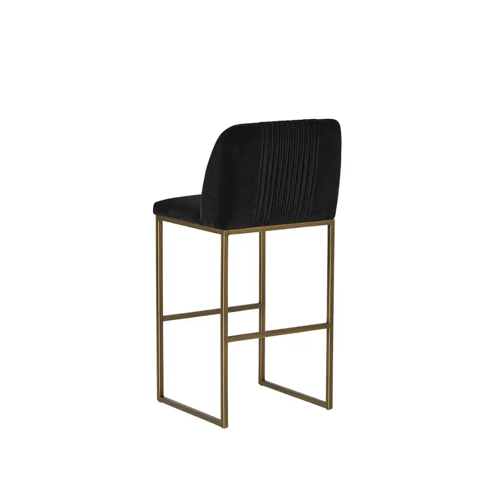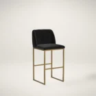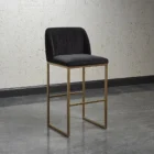 A modern barstool from that offers style and comfort. Features delicate ruching on the rounded seatback and exposed antique brass legs. Stocked in shadow grey fabric. Suitable for various dining, kitchen and bar spaces of all sizes.