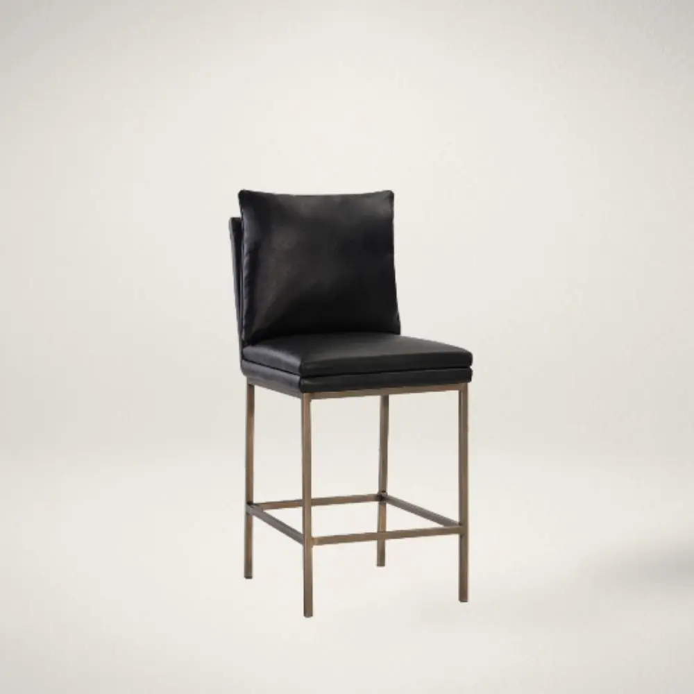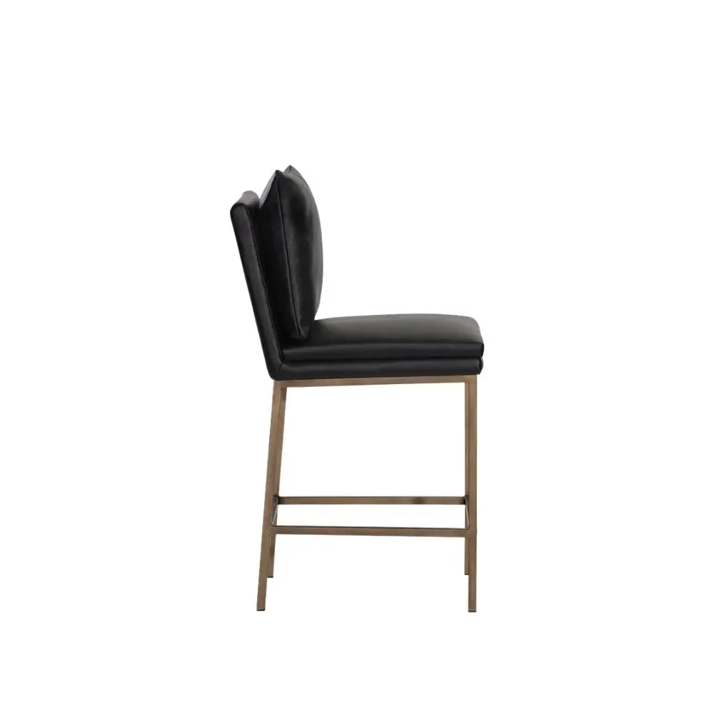 This counter stool features a clean and comfortable design. Designed with a cushion-like seat back in bravo black faux leather with antique brass iron legs. Suitable for various dining, kitchen and bar spaces of all sizes. Handle With Care: This design has been crafted with faux leather. Faux leather is manufactured to reflect the natural characteristics of leather; as such, colour variations, markings, wrinkles, grooves, and light scratches are appreciated characteristics. No two pieces will be alike.