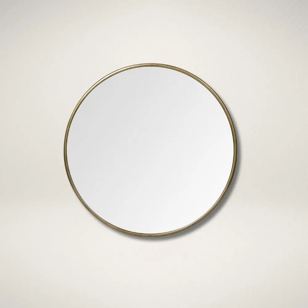 A simple round metal mirror featuring an antique black frame with a brushed silver finish