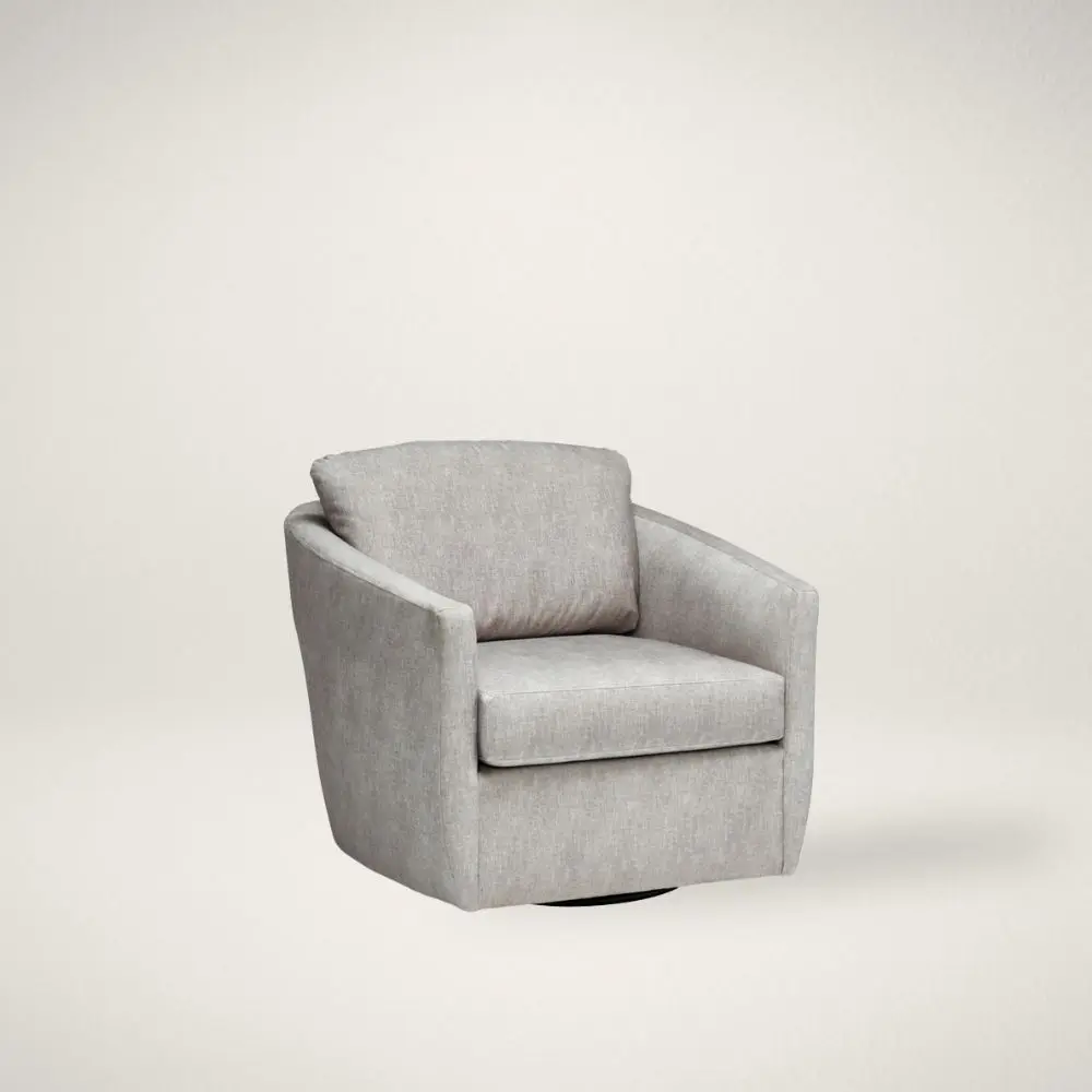 Sleek, compact, and effortlessly stylish, this modern barrel-back swivel chair is the perfect blend of form and function. Upholstered in a soft, heathered fabric, its clean lines and gently curved silhouette offer a cozy seat without taking up too much space. Ideal for small living areas, bedrooms, or reading nooks, the smooth swivel base adds flexibility and comfort to any modern interior.