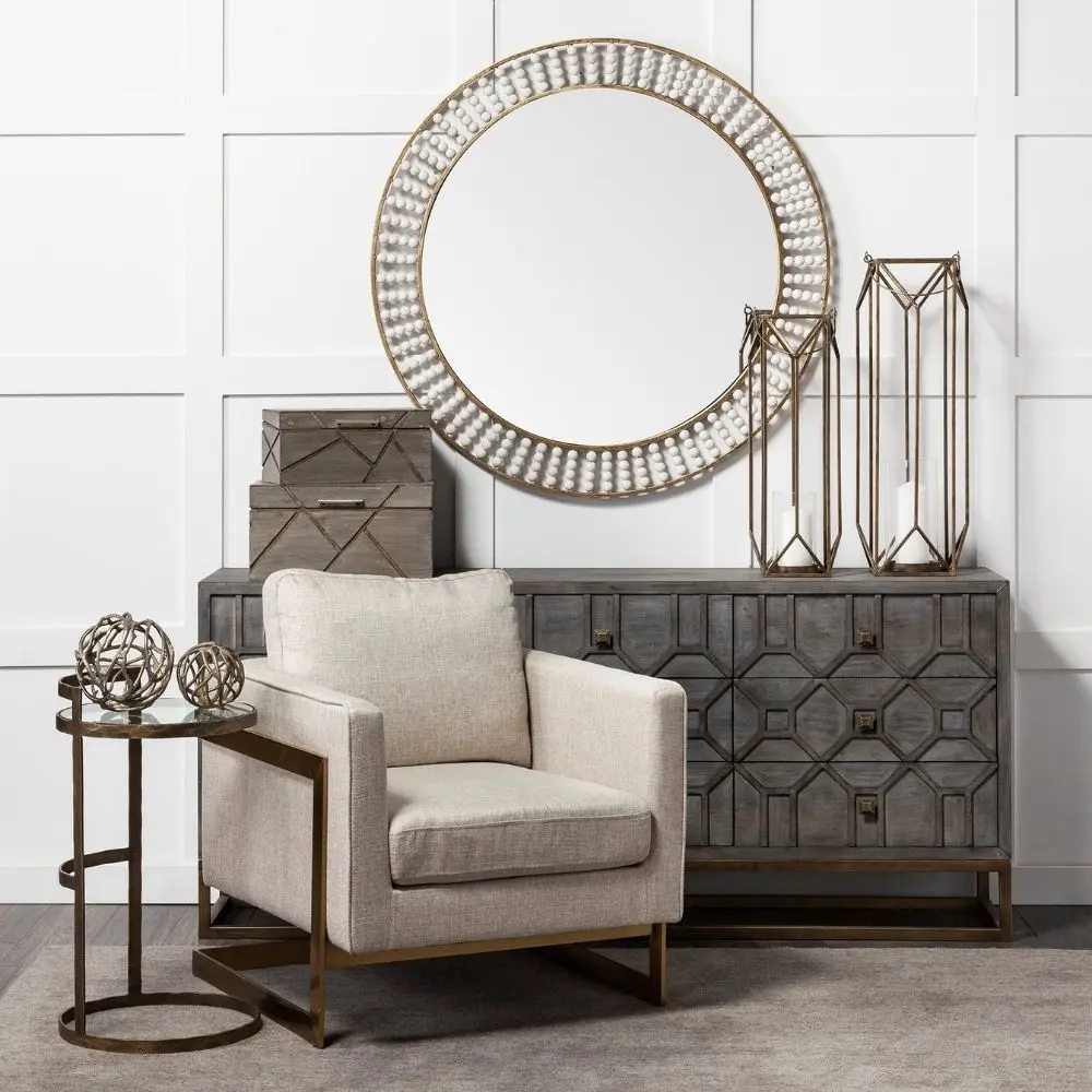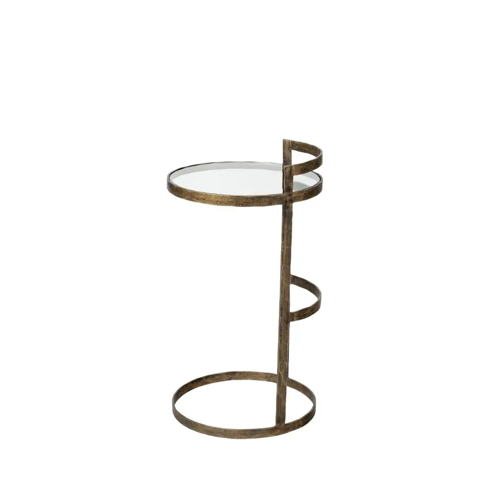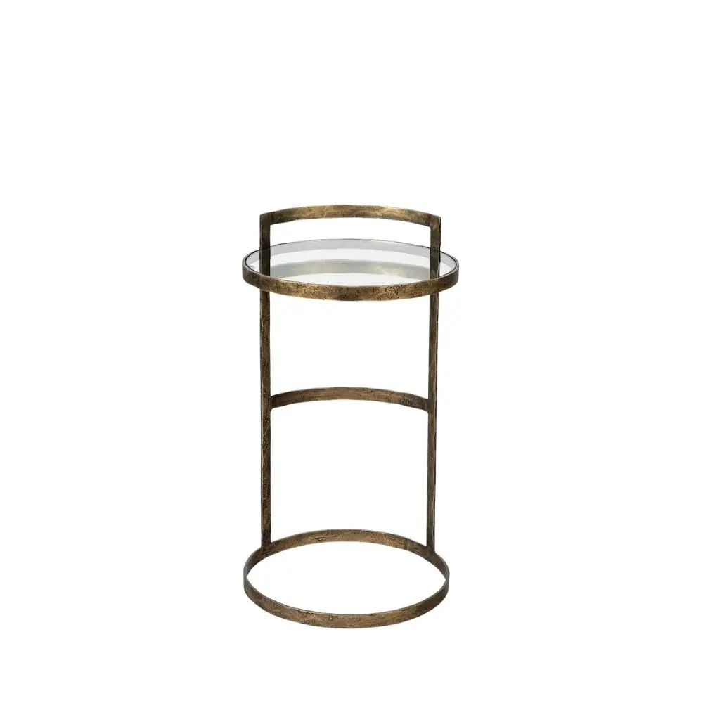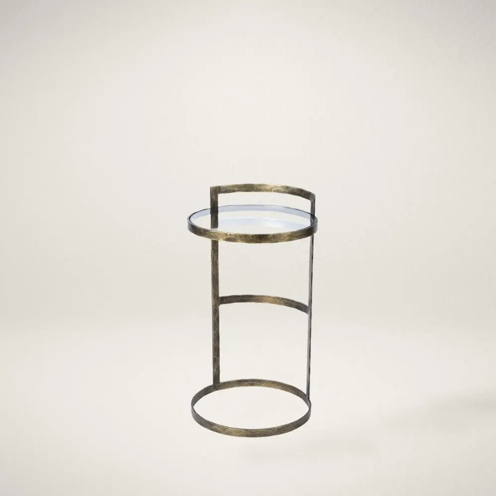 - The Reimer accent table, expertly constructed from antiqued-gold toned iron and glass, makes for a sturdy and substantial addition to your space.