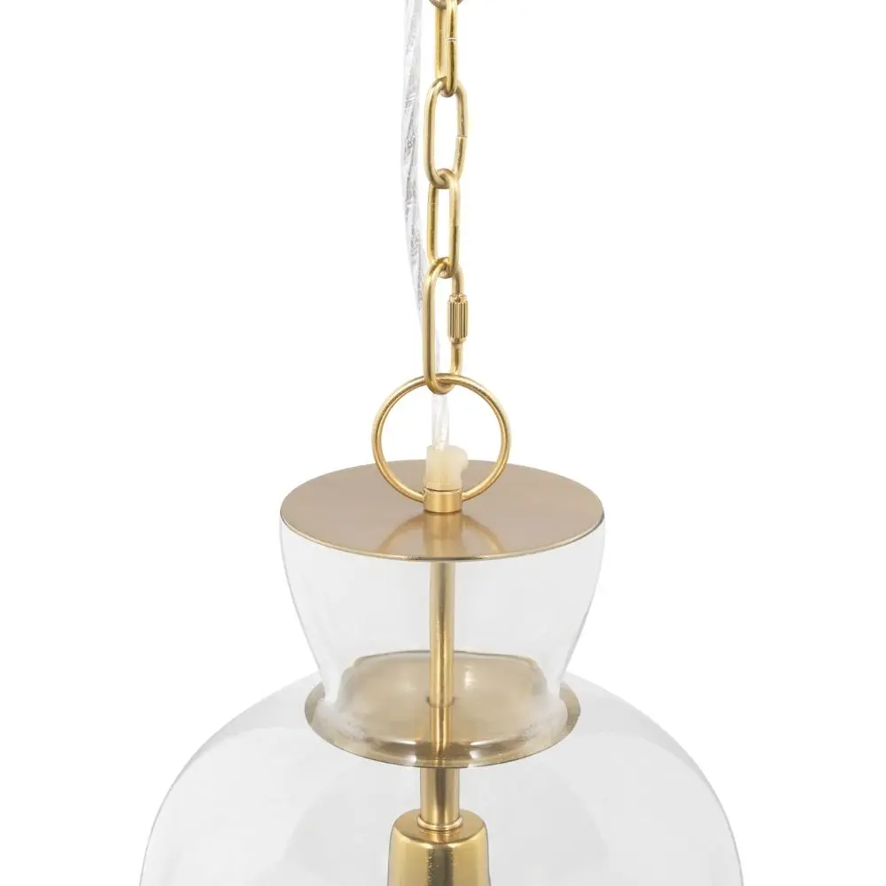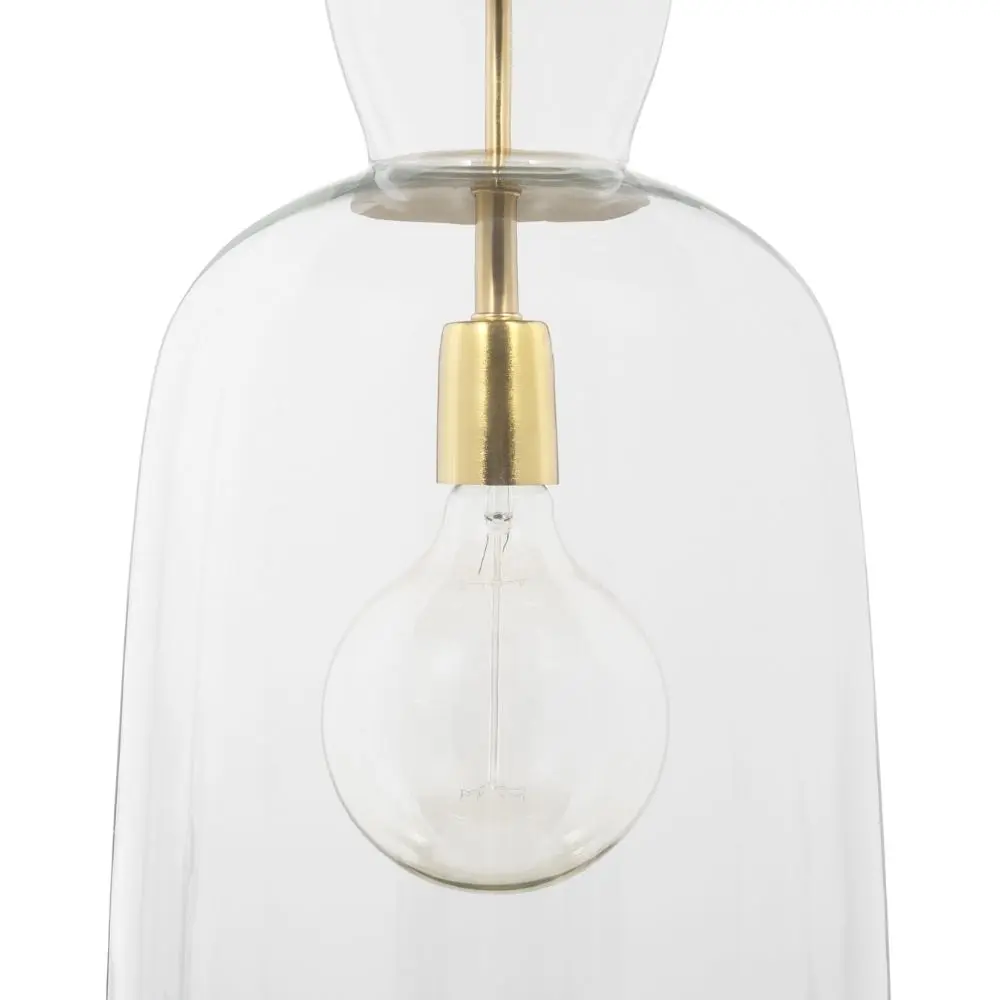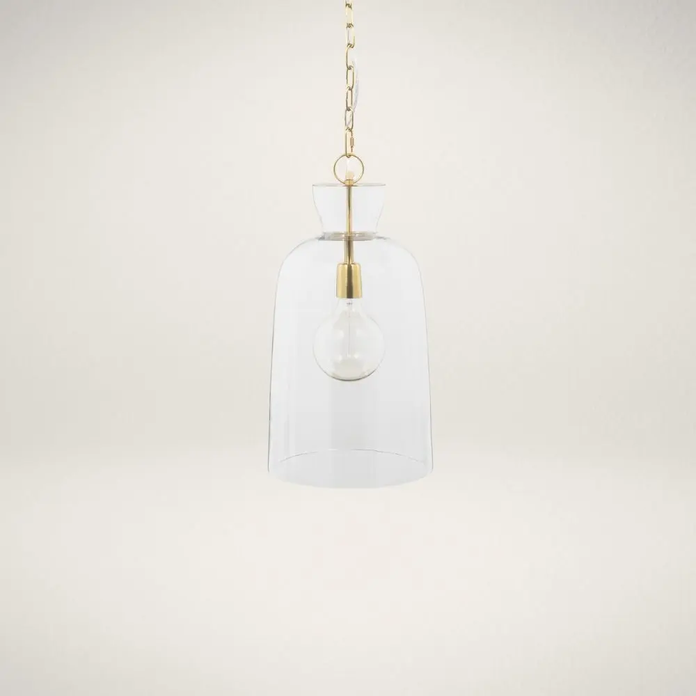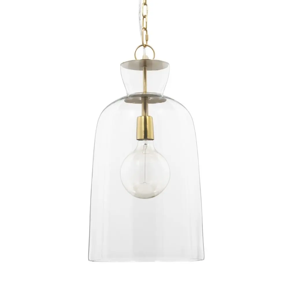 - This pendant will stand the test of time with its clear glass, gentle curves, and brushed brass colored metal accents