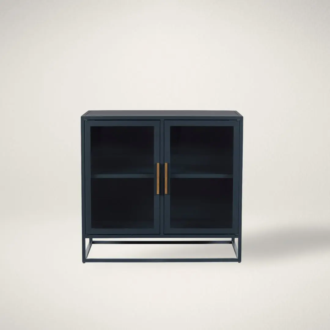 The striking Santorini Metal Kitchen Cabinet elevates interiors with calming seaside vibes, showcasing an alluring deep blue finish, clear glass doors, and sleek bronze bar hardware.