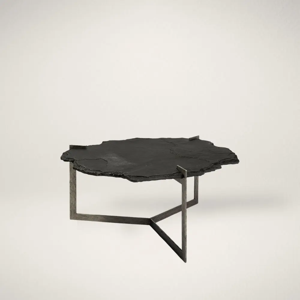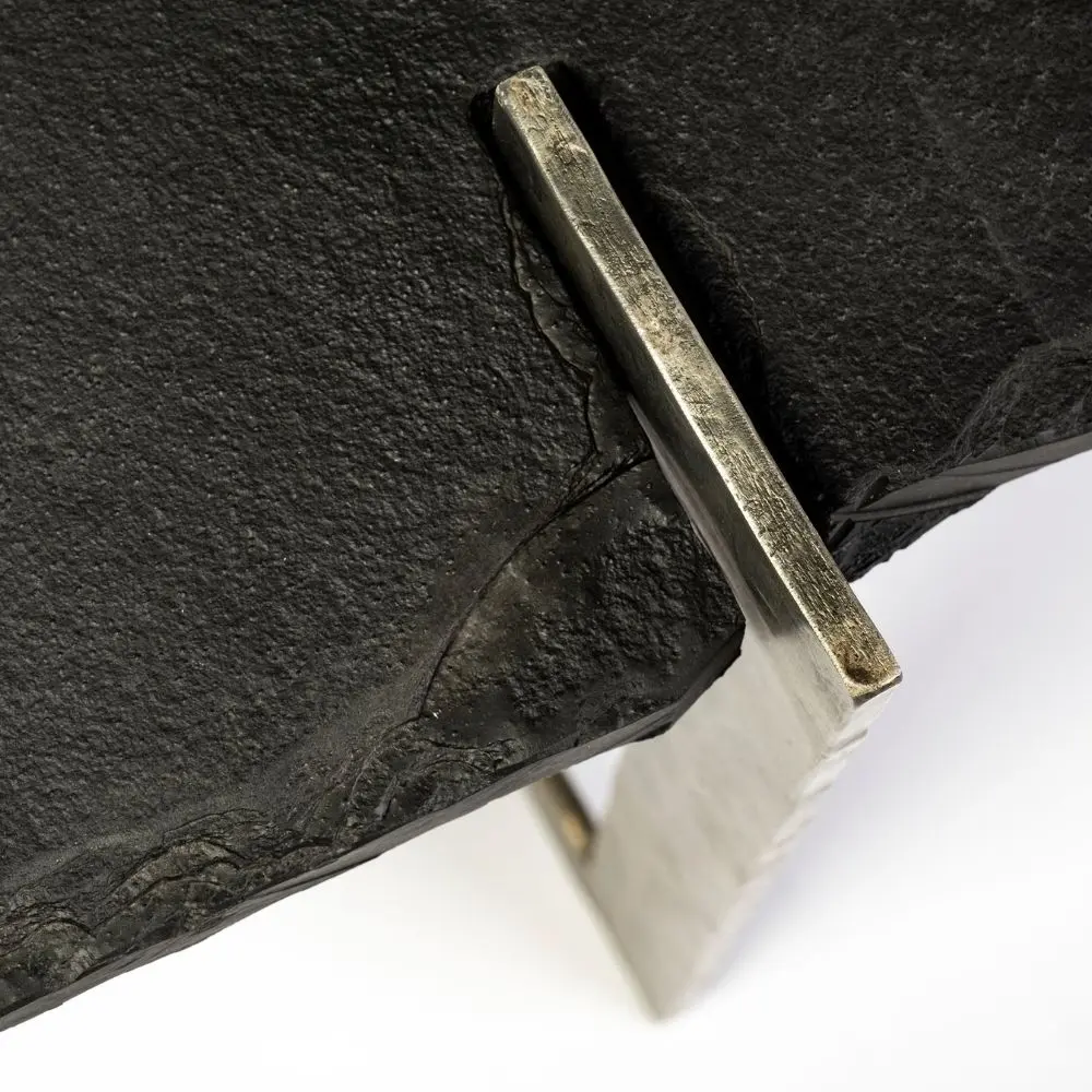 - Material: Natural slate top rests om a tripod-shaped iron frame