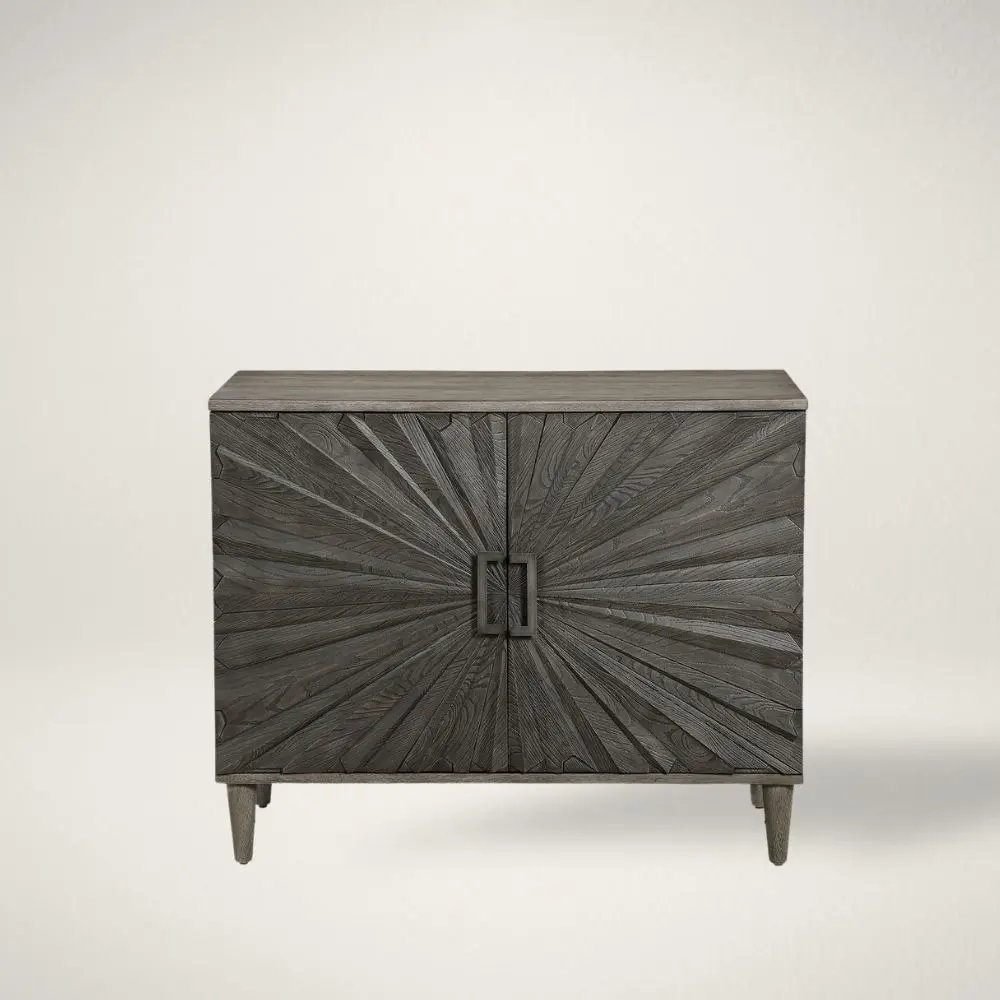 - Carved front panels, sunburst design that adds depth, texture, and visual drama.