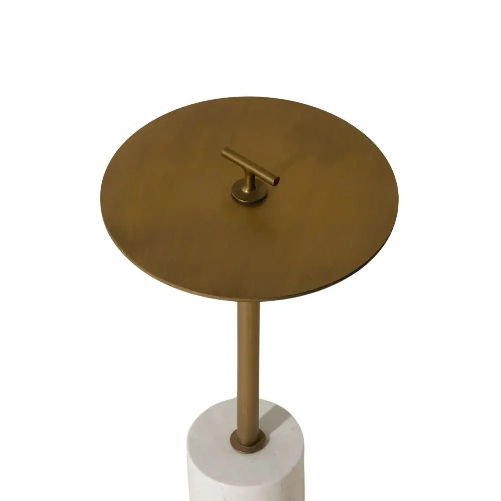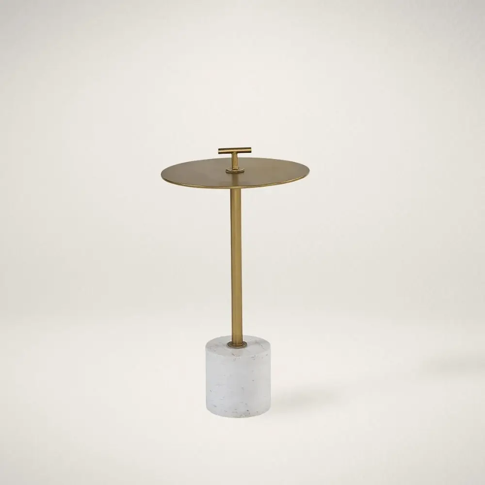 This sculptural side table is a beauty from all angles. Features a powder-coated burnished brass top and handle with a white Volakas marble base. A perfect addition for small spaces. As marble is a natural material, unique veining, pitting, fissures, micro-cracks and colour variations are all characteristics that add to the uniqueness and beauty of each piece.