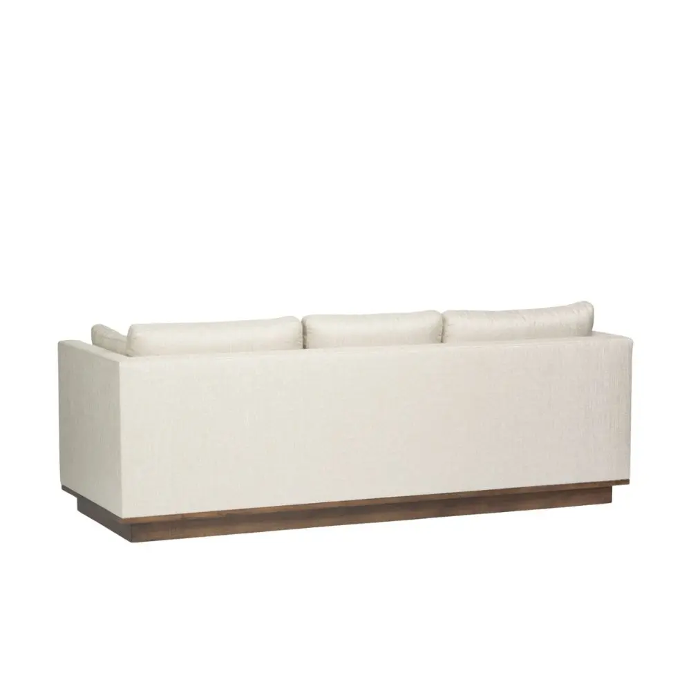 With its clean lines and tailored silhouette, this contemporary sofa offers a refined yet relaxed presence ideal for modern interiors. Upholstered in a soft, textured neutral fabric, it features deep, supportive cushions and a solid wood plinth base that grounds the design with warmth and architectural appeal. Perfect for both casual lounging and sophisticated entertaining, this piece blends timeless comfort with understated luxury; an effortless foundation for any curated space.