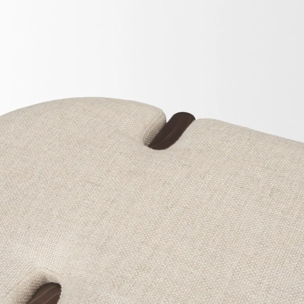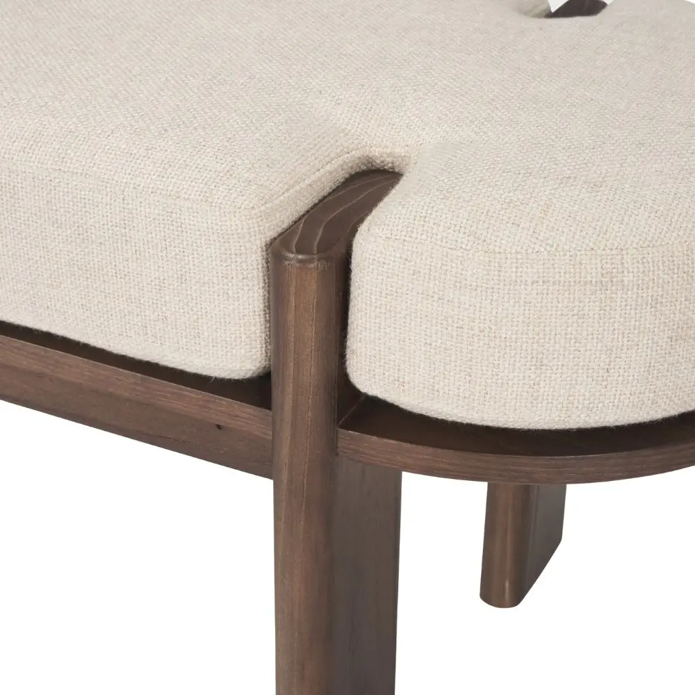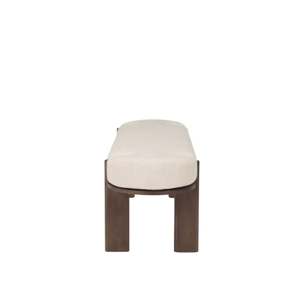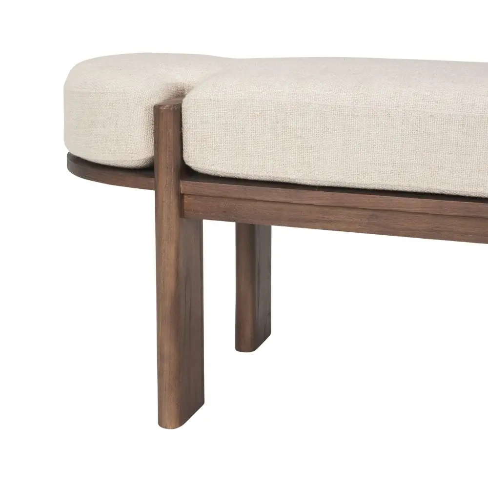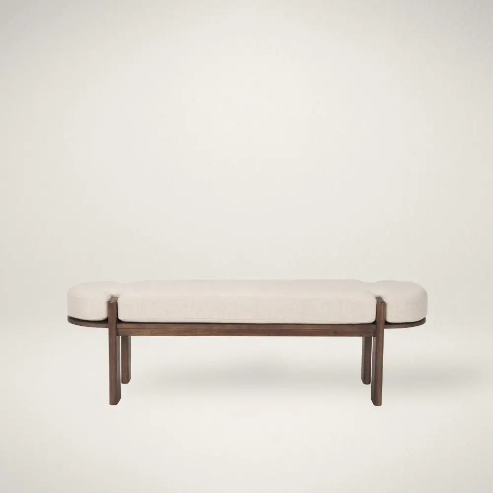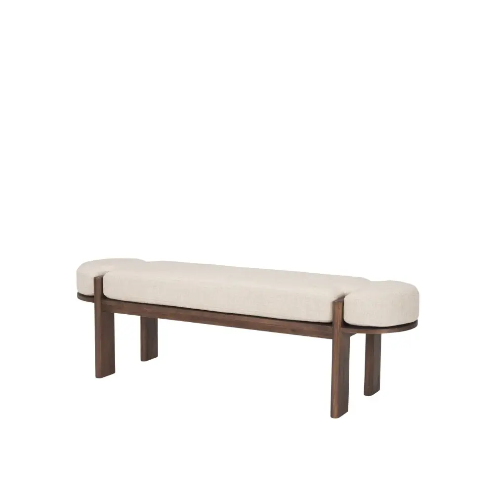 Sohan is a neutral, contemporary bench featuring clean lines, curved edges, and an oblong shape.  Crafted from solid elm wood and finished with a contrasting, rich dark brown stain, its removable cushion, upholstered in a desirable oatmeal fabric, offers both sophistication and convenience. Both the cushion and its cover can be easily taken off for hassle-free cleaning. Whether placed in an entryway, living room, or bedroom, Sohan effortlessly enhances any environment with its neutral palette and timeless appeal.