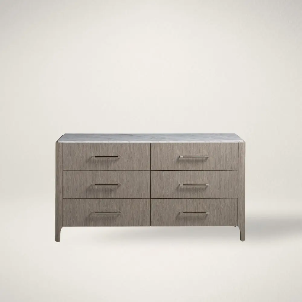 Add depth and intrigue to spaces with the Soren Dresser, a neutral-hued storage piece featuring a smooth stone top and six spacious drawers accented by sleek bar hardware.