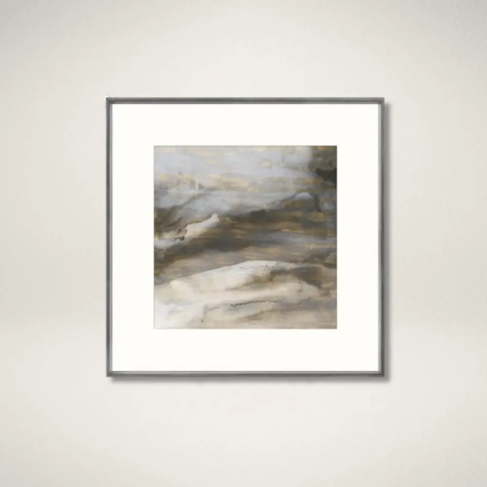 An ethereal layering of neutral toned washes creates a nuanced depth in these lovely abstracts. Wonderful individually or as a set. Framed with a wide matte and gray wash frame with angled, inner silver lip.