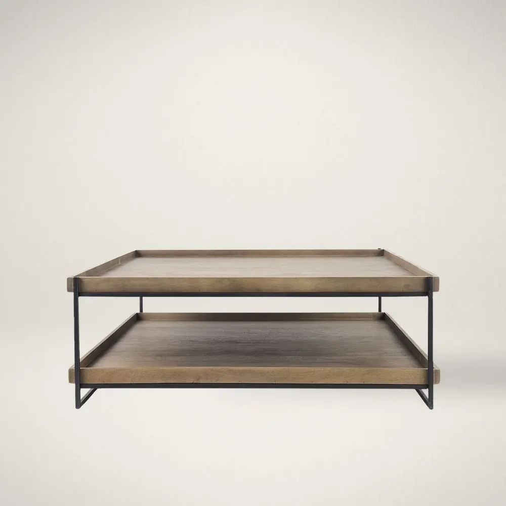 - A statement piece with its coal-black iron frame and solid mango wood shelves