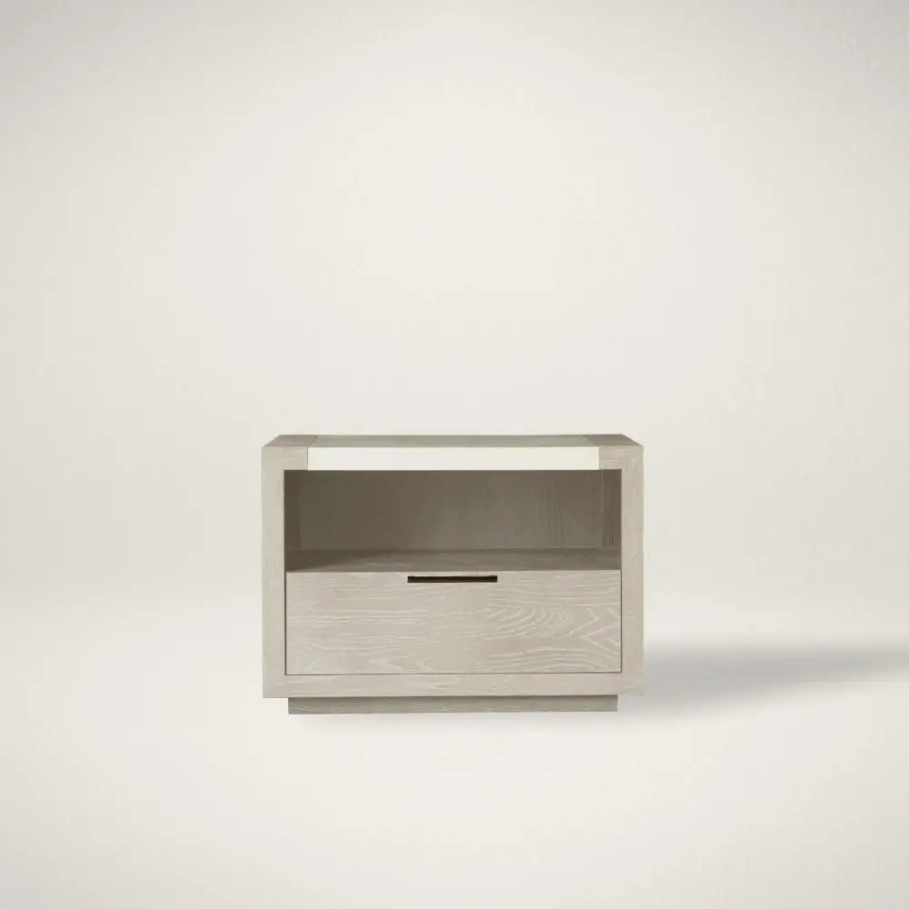 Available in a light Quartz finish and a medium Charcoal tone, the Wilshire Nightstand is a breezy bedside accent emphasized by a smooth stone top.
